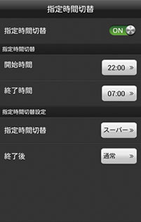 | ②【指定時間切替】 指定した時間帯だけ節電モードを切り替えることができますので、端末を使うことが多い時間帯は「通常」モード、あまり使わない夜中の時間帯などは「スーパー」モードと使い分けることができます。 |