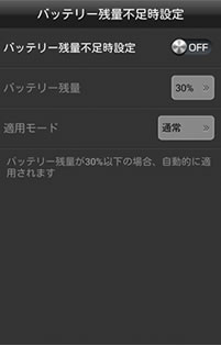| ③【残量不足時設定】 指定したバッテリー残量になると、あらかじめ設定したモードに切り替わり、端末の利用可能時間を延ばすことができます。 |
