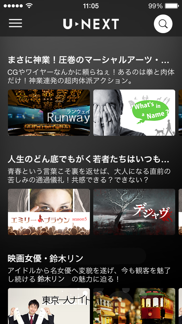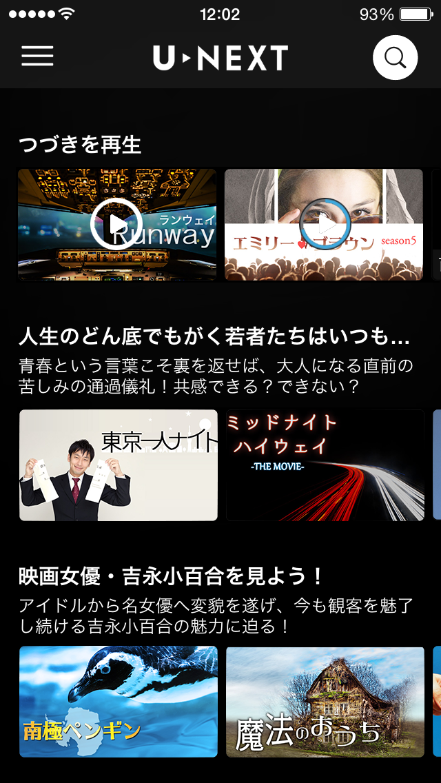| 「U-NEXT」アプリを起動し、画面左上のアイコンをタップ | ![]() |
