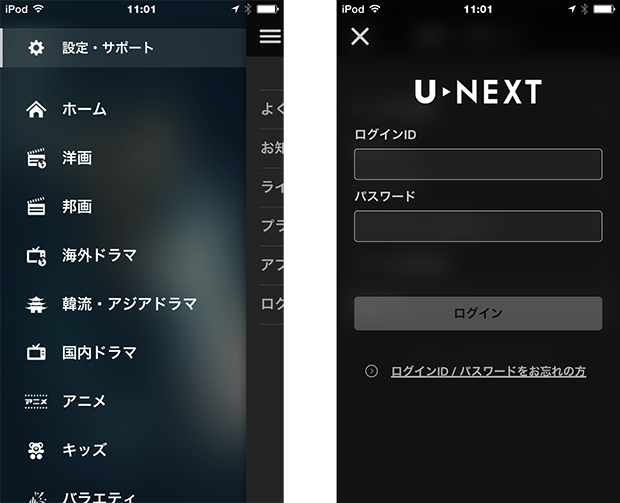 | 設定・サポートから「ログイン」へ、EXPO with U-NEXT スマートオンラインムービー7日間見放題サービスログインIDとパスワードを入力し「ログイン」をタップ | ![]() |