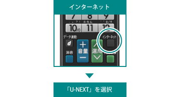 | [シャープ]〈アクオス〉の場合 お手元のリモコンの「インターネット」ボタンを押してください。 ⇒コンテンツ一覧より、「U-NEXT」を選択 |