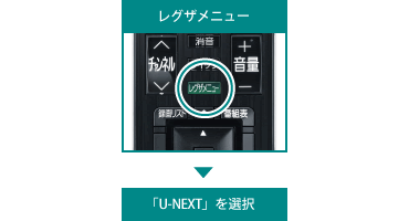 | [TOSHIBA]〈REGZA〉の場合 お手元のリモコンの「レグザメニュー」ボタンを押してください。 ⇒コンテンツ一覧より、「U-NEXT」を選択 |