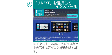 | ④「U-NEXT」を選択してインストール ※インストール後ビエラコネクトのTopにアイコ ンが追加されます。 ⇒コンテンツ一覧より、「U-NEXT」を選択 |